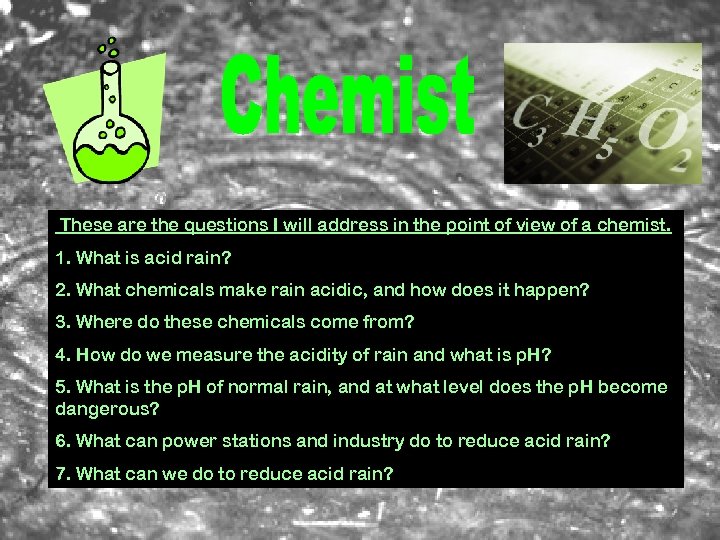 These are the questions I will address in the point of view of a chemist. 1. What is acid rain? 2. What chemicals make rain acidic, and how does it happen? 3. Where do these chemicals come from? 4. How do we measure the acidity of rain and what is p. H? 5. What is the p. H of normal rain, and at what level does the p. H become dangerous? 6. What can power stations and industry do to reduce acid rain? 7. What can we do to reduce acid rain?