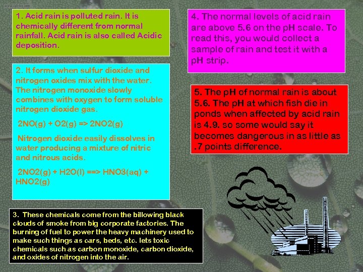 1. Acid rain is polluted rain. It is chemically different from normal rainfall. Acid rain is also called Acidic deposition. 4. The normal levels of acid rain are above 5. 6 on the p. H scale. To read this, you would collect a sample of rain and test it with a p. H strip. 2. It forms when sulfur dioxide and nitrogen oxides mix with the water. The nitrogen monoxide slowly combines with oxygen to form soluble nitrogen dioxide gas. 2 NO(g) + O 2(g) => 2 NO 2(g) Nitrogen dioxide easily dissolves in water producing a mixture of nitric and nitrous acids. 2 NO 2(g) + H 2 O(l) ==> HNO 3(aq) + HNO 2(g) 3. These chemicals come from the billowing black clouds of smoke from big corporate factories. The burning of fuel to power the heavy machinery used to make such things as cars, beds, etc. lets toxic chemicals such as carbon monoxide, carbon dioxide, and oxides of nitrogen into the air. 5. The p. H of normal rain is about 5. 6. The p. H at which fish die in ponds when affected by acid rain is 4. 9. so some would say it becomes dangerous in as little as. 7 points difference.