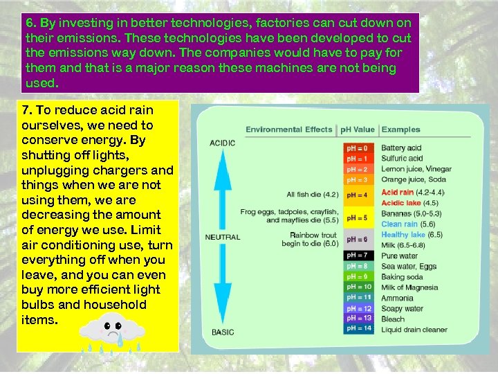 6. By investing in better technologies, factories can cut down on their emissions. These technologies have been developed to cut the emissions way down. The companies would have to pay for them and that is a major reason these machines are not being used. 7. To reduce acid rain ourselves, we need to conserve energy. By shutting off lights, unplugging chargers and things when we are not using them, we are decreasing the amount of energy we use. Limit air conditioning use, turn everything off when you leave, and you can even buy more efficient light bulbs and household items.