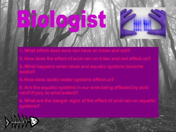1. What effect does acid rain have on trees and soil? 2. How does the effect of acid rain on trees and soil affect us? 3. What happens when lakes and aquatic systems become acidic? 4. How does acidic water systems affect us? 5. Are the aquatic systems in our area being affected by acid rain? If yes, to what extent? 6. What are the danger signs of the effect of acid rain on aquatic systems?