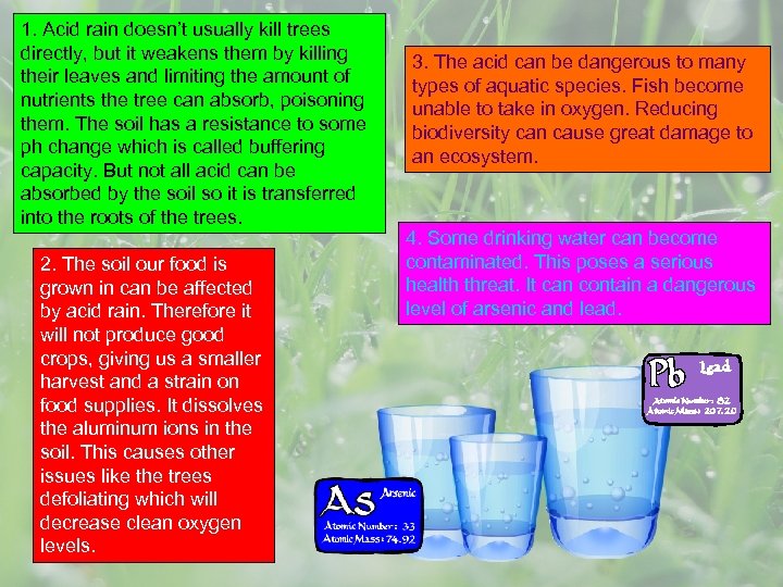1. Acid rain doesn’t usually kill trees directly, but it weakens them by killing their leaves and limiting the amount of nutrients the tree can absorb, poisoning them. The soil has a resistance to some ph change which is called buffering capacity. But not all acid can be absorbed by the soil so it is transferred into the roots of the trees. 2. The soil our food is grown in can be affected by acid rain. Therefore it will not produce good crops, giving us a smaller harvest and a strain on food supplies. It dissolves the aluminum ions in the soil. This causes other issues like the trees defoliating which will decrease clean oxygen levels. 3. The acid can be dangerous to many types of aquatic species. Fish become unable to take in oxygen. Reducing biodiversity can cause great damage to an ecosystem. 4. Some drinking water can become contaminated. This poses a serious health threat. It can contain a dangerous level of arsenic and lead.