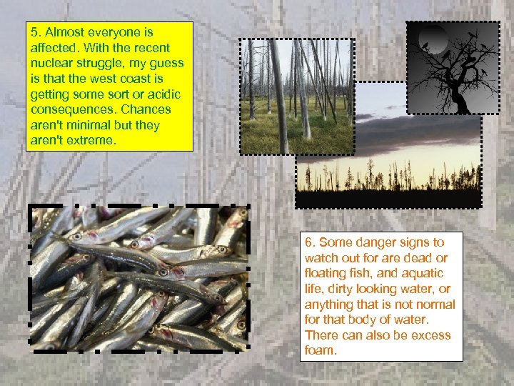 5. Almost everyone is affected. With the recent nuclear struggle, my guess is that the west coast is getting some sort or acidic consequences. Chances aren't minimal but they aren't extreme. 6. Some danger signs to watch out for are dead or floating fish, and aquatic life, dirty looking water, or anything that is not normal for that body of water. There can also be excess foam.