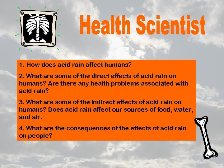 1. How does acid rain affect humans? 2. What are some of the direct effects of acid rain on humans? Are there any health problems associated with acid rain? 3. What are some of the indirect effects of acid rain on humans? Does acid rain affect our sources of food, water, and air. 4. What are the consequences of the effects of acid rain on people?
