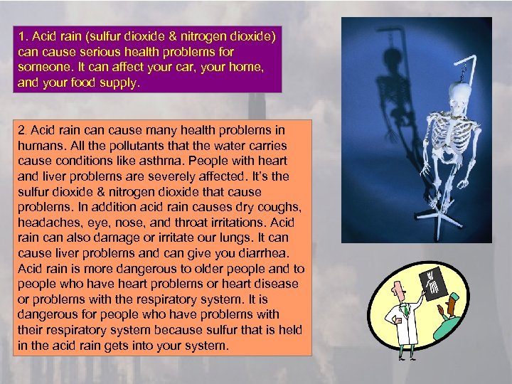 1. Acid rain (sulfur dioxide & nitrogen dioxide) can cause serious health problems for someone. It can affect your car, your home, and your food supply. 2. Acid rain cause many health problems in humans. All the pollutants that the water carries cause conditions like asthma. People with heart and liver problems are severely affected. It’s the sulfur dioxide & nitrogen dioxide that cause problems. In addition acid rain causes dry coughs, headaches, eye, nose, and throat irritations. Acid rain can also damage or irritate our lungs. It can cause liver problems and can give you diarrhea. Acid rain is more dangerous to older people and to people who have heart problems or heart disease or problems with the respiratory system. It is dangerous for people who have problems with their respiratory system because sulfur that is held in the acid rain gets into your system.