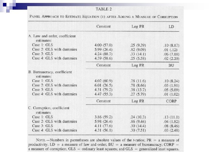 Obtención de los datos: Medidas de corrupción International Country Risk Guide , una publicación mensual sobre servicios de riesgo político. Representa un índice que va desde 0 a 6, donde 0 debería ser el objetivo de un país y 6 es la tasa más alta de corrupción. Tipo de cambio real (v. 13) y Productividad (v. 19) Penn World Table (Mark 5) by Robert Summers and Alan Heston La productividad es medida como la razón entre PIB real por trabajador a precios internacionales de 1985. La muestra es de 65 Países entre los cuales se encuentran Algeria, Argentina, Australia, Austria, Bangladesh, Belgium, Bolivia, Brazil, Cameroon, Canada, Chile, Colombia, Costa Rica, Denmark, Dominican Republic, Ecuador, El Salvador, Finland, France, West Germany, Greece, Guatemala, Honduras, Hong Kong, India, Indonesia, Ireland, Israel, Italy, Jamaica, Japan, Jordan, Kenya, Korea, Malawi, Malaysia, Mexico, Morocco, the Netherlands, New Zealand, Nicaragua, Nigeria, Norway, Pakistan, Panama, Paraguay, Peru, Philippines, Portugal, Senegal, Singapore, Spain, Sri Lanka, Sweden, Switzerland, Syria, Thailand, Trinidad and Tobago, Tunisia, Turkey, the United Kingdom, Uruguay, Venezuela, Zambia, and Zimbabwe. Se utilizaron datos desde 1982 a 1990.