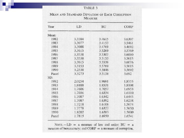 n Ahora se agregan tres diferentes medidas de corrupción (a cierto tiempo) en la ecuación 1 para medir su impacto en el tipo de cambio real. Donde LD mide la calidad y cantidad sobre la existencia de leyes y orden jurídico. Un país con un resultado bajo es sujeto de ausencia de orden pacífico. Dado que algunos países demuestran altas tasas de corrupción, podemos concluir que una disminución en LD (aumento en corrupción) resulta en una depreciación y por lo tanto en un coeficiente positivo c 1. Las variables BU (burocracia) y CORP (corrupción) son usadas como proxy´s de eficiencia de un gobierno. Se espera que los coeficientes c 2 y c 3 sean positivos, ya que una disminución en BU o en CORP (aumento en corrupción) provocará una depreciación real.