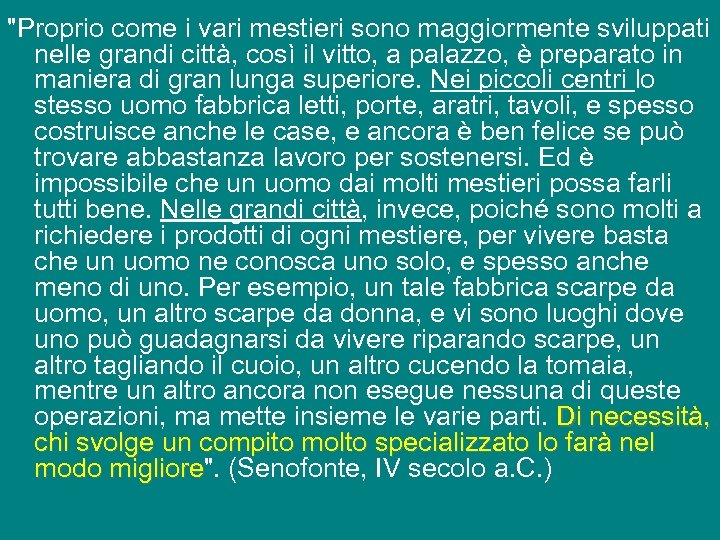 "Proprio come i vari mestieri sono maggiormente sviluppati nelle grandi città, così il vitto, a palazzo, è preparato in maniera di gran lunga superiore. Nei piccoli centri lo stesso uomo fabbrica letti, porte, aratri, tavoli, e spesso costruisce anche le case, e ancora è ben felice se può trovare abbastanza lavoro per sostenersi. Ed è impossibile che un uomo dai molti mestieri possa farli tutti bene. Nelle grandi città, invece, poiché sono molti a richiedere i prodotti di ogni mestiere, per vivere basta che un uomo ne conosca uno solo, e spesso anche meno di uno. Per esempio, un tale fabbrica scarpe da uomo, un altro scarpe da donna, e vi sono luoghi dove uno può guadagnarsi da vivere riparando scarpe, un altro tagliando il cuoio, un altro cucendo la tomaia, mentre un altro ancora non esegue nessuna di queste operazioni, ma mette insieme le varie parti. Di necessità, chi svolge un compito molto specializzato lo farà nel modo migliore". (Senofonte, IV secolo a. C. ) migliore