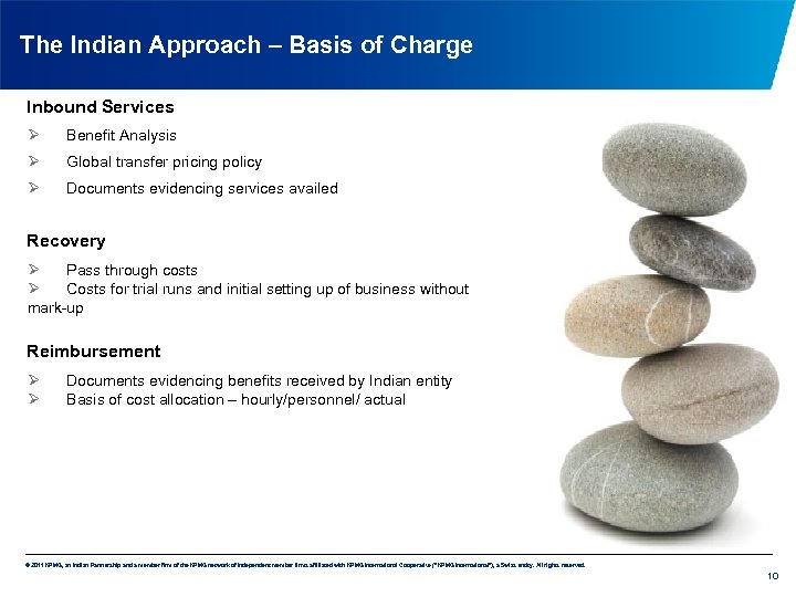 The Indian Approach – Basis of Charge Outbound Services • Cost plus Model – Determining cost base Ø Direct / indirect cost Ø Management overheads Ø Notional Cost – Determining a mark-up Ø Ø • Comparison of captive unit with independent companies Possibility of risk adjustment Hourly / Man Day Rate Model – Comparison of transactions hourly rate charged in related and unrelated – Adjustment on account of idle capacity/under-utilization of capacity © 2011 KPMG, an Indian Partnership and a member firm of the KPMG network of independent member firms affiliated with KPMG International Cooperative (“KPMG International”), a Swiss entity. All rights reserved. 9