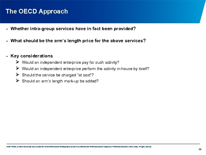The Indian Approach – Basis of Charge Inbound Services Ø Benefit Analysis Ø Global transfer pricing policy Ø Documents evidencing services availed Recovery Ø Pass through costs Ø Costs for trial runs and initial setting up of business without mark-up Reimbursement Ø Ø Documents evidencing benefits received by Indian entity Basis of cost allocation – hourly/personnel/ actual © 2011 KPMG, an Indian Partnership and a member firm of the KPMG network of independent member firms affiliated with KPMG International Cooperative (“KPMG International”), a Swiss entity. All rights reserved. 10