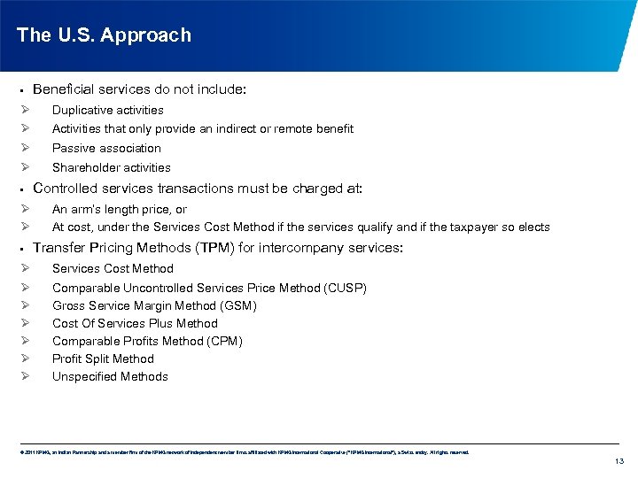 The U. S. Approach • • The Final Services Regulations (‘FSR’) are effective for taxable years beginning after July 31, 2009 Taxpayers may elect to apply the FSR to taxable years beginning after September 10, 2003 : Ø If election is made, all provisions of the Temporary Regulations will apply, i. e. , no cherry picking of provisions Ø Election applies to first year specified and all subsequent taxable years, e. g. , if elected for 2004, also applies to 2005 and 2006 • The regulations are relevant to ‘activities’, broadly defined Ø “includes the performance of functions, assumption of risks, or use by a renderer of tangible or intangible property or other resources, capabilities or knowledge. . ” • A service renderer must charge for activities that provide a direct benefit to a controlled party (a “controlled services transaction”) © 2011 KPMG, an Indian Partnership and a member firm of the KPMG network of independent member firms affiliated with KPMG International Cooperative (“KPMG International”), a Swiss entity. All rights reserved. 12