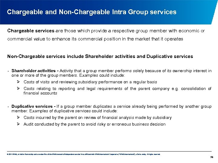 The U. S. Approach • Beneficial services do not include: Ø Duplicative activities Ø Activities that only provide an indirect or remote benefit Ø Passive association Ø Shareholder activities • Ø Ø • Controlled services transactions must be charged at: An arm’s length price, or At cost, under the Services Cost Method if the services qualify and if the taxpayer so elects Transfer Pricing Methods (TPM) for intercompany services: Ø Services Cost Method Ø Ø Ø Comparable Uncontrolled Services Price Method (CUSP) Gross Service Margin Method (GSM) Cost Of Services Plus Method Comparable Profits Method (CPM) Profit Split Method Unspecified Methods © 2011 KPMG, an Indian Partnership and a member firm of the KPMG network of independent member firms affiliated with KPMG International Cooperative (“KPMG International”), a Swiss entity. All rights reserved. 13