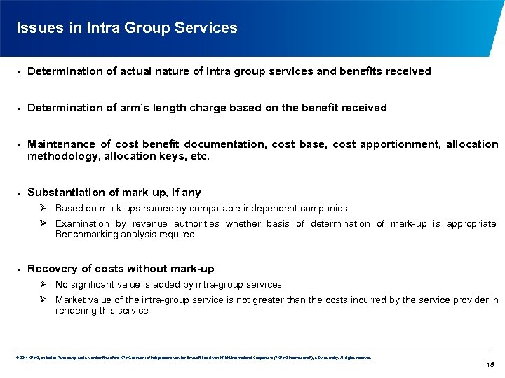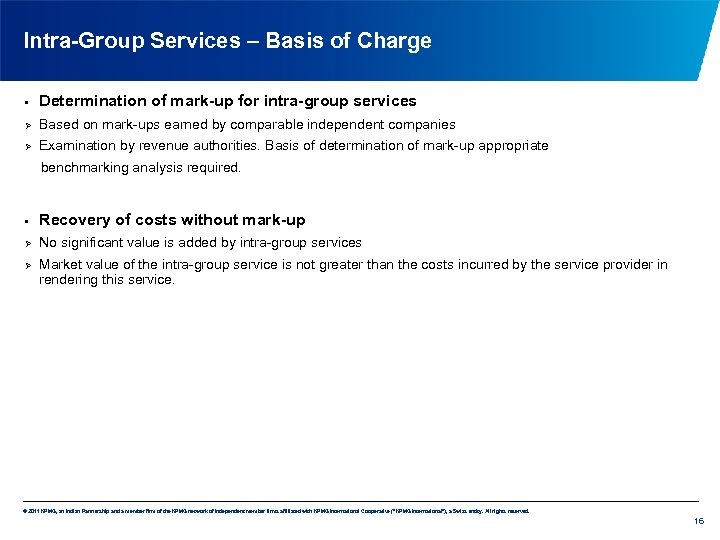 Issues in Intra Group Services • Determination of actual nature of intra group services and benefits received • Determination of arm’s length charge based on the benefit received • • Maintenance of cost benefit documentation, cost base, cost apportionment, allocation methodology, allocation keys, etc. Substantiation of mark up, if any Ø Based on mark-ups earned by comparable independent companies Ø Examination by revenue authorities whether basis of determination of mark-up is appropriate. Benchmarking analysis required. • Recovery of costs without mark-up Ø No significant value is added by intra-group services Ø Market value of the intra-group service is not greater than the costs incurred by the service provider in rendering this service © 2011 KPMG, an Indian Partnership and a member firm of the KPMG network of independent member firms affiliated with KPMG International Cooperative (“KPMG International”), a Swiss entity. All rights reserved. 15 15