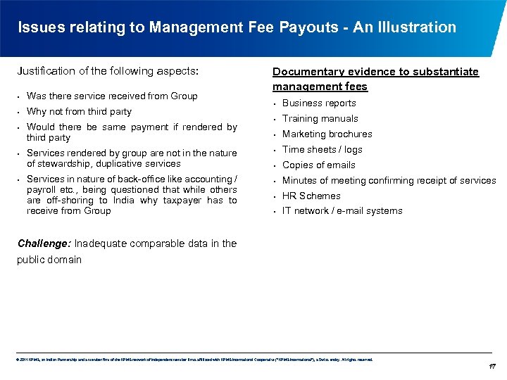 Intra-Group Services – Basis of Charge • Determination of mark-up for intra-group services Ø Based on mark-ups earned by comparable independent companies Ø Examination by revenue authorities. Basis of determination of mark-up appropriate benchmarking analysis required. • Recovery of costs without mark-up Ø No significant value is added by intra-group services Ø Market value of the intra-group service is not greater than the costs incurred by the service provider in rendering this service. © 2011 KPMG, an Indian Partnership and a member firm of the KPMG network of independent member firms affiliated with KPMG International Cooperative (“KPMG International”), a Swiss entity. All rights reserved. 16