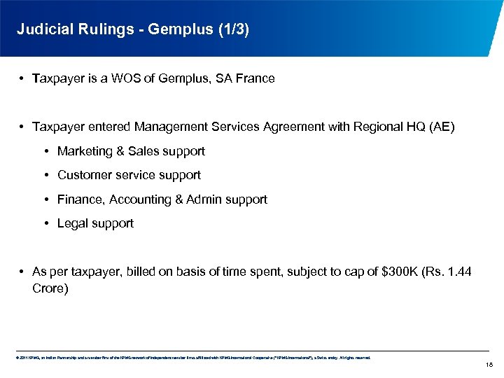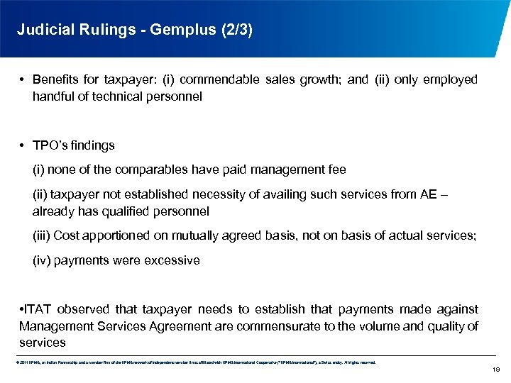 Judicial Rulings - Gemplus (1/3) • Taxpayer is a WOS of Gemplus, SA France • Taxpayer entered Management Services Agreement with Regional HQ (AE) • Marketing & Sales support • Customer service support • Finance, Accounting & Admin support • Legal support • As per taxpayer, billed on basis of time spent, subject to cap of $300 K (Rs. 1. 44 Crore) © 2011 KPMG, an Indian Partnership and a member firm of the KPMG network of independent member firms affiliated with KPMG International Cooperative (“KPMG International”), a Swiss entity. All rights reserved. 18