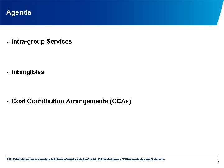 Agenda • Intra-group Services • Intangibles • Cost Contribution Arrangements (CCAs) © 2011 KPMG, an Indian Partnership and a member firm of the KPMG network of independent member firms affiliated with KPMG International Cooperative (“KPMG International”), a Swiss entity. All rights reserved. 2 2
