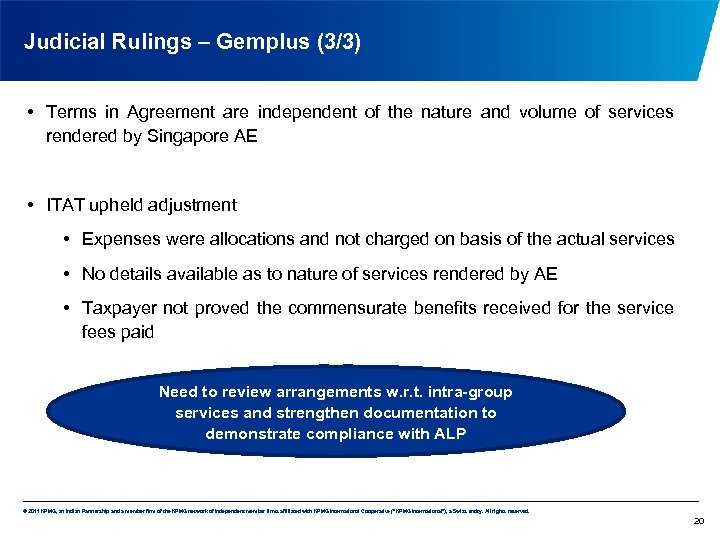 Judicial Rulings - Gemplus (2/3) • Benefits for taxpayer: (i) commendable sales growth; and (ii) only employed handful of technical personnel • TPO’s findings (i) none of the comparables have paid management fee (ii) taxpayer not established necessity of availing such services from AE – already has qualified personnel (iii) Cost apportioned on mutually agreed basis, not on basis of actual services; (iv) payments were excessive • ITAT observed that taxpayer needs to establish that payments made against Management Services Agreement are commensurate to the volume and quality of services © 2011 KPMG, an Indian Partnership and a member firm of the KPMG network of independent member firms affiliated with KPMG International Cooperative (“KPMG International”), a Swiss entity. All rights reserved. 19