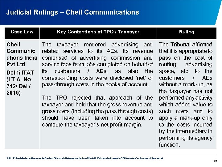 Judicial Rulings – Gemplus (3/3) • Terms in Agreement are independent of the nature and volume of services rendered by Singapore AE • ITAT upheld adjustment • Expenses were allocations and not charged on basis of the actual services • No details available as to nature of services rendered by AE • Taxpayer not proved the commensurate benefits received for the service fees paid Need to review arrangements w. r. t. intra-group services and strengthen documentation to demonstrate compliance with ALP © 2011 KPMG, an Indian Partnership and a member firm of the KPMG network of independent member firms affiliated with KPMG International Cooperative (“KPMG International”), a Swiss entity. All rights reserved. 20