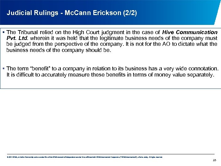 Judicial Rulings - Mc. Cann Erickson (1/2) • Delhi Tribunal’s Ruling – Management services received from AE § The taxpayer had placed substantial evidence in respect of the management service charges and client coordination fee on record and had been able to establish the nature and benefits of services provided by the Associated Enterprise (AE). The tax department had not brought out anything to negate such evidence. § The taxpayer is engaged in only one class of business. There are no segments which can be said to be independent of each other. Entity level benchmarking using the Transactional Net Margin Method (TNMM) shall be most appropriate. § Considering the business environment of the taxpayer, it would be difficult to operate successfully without receipt of services which carry huge intrinsic and creative value. Only a business expert can evaluate the true intrinsic and creative value of such services. © 2011 KPMG, an Indian Partnership and a member firm of the KPMG network of independent member firms affiliated with KPMG International Cooperative (“KPMG International”), a Swiss entity. All rights reserved. 22