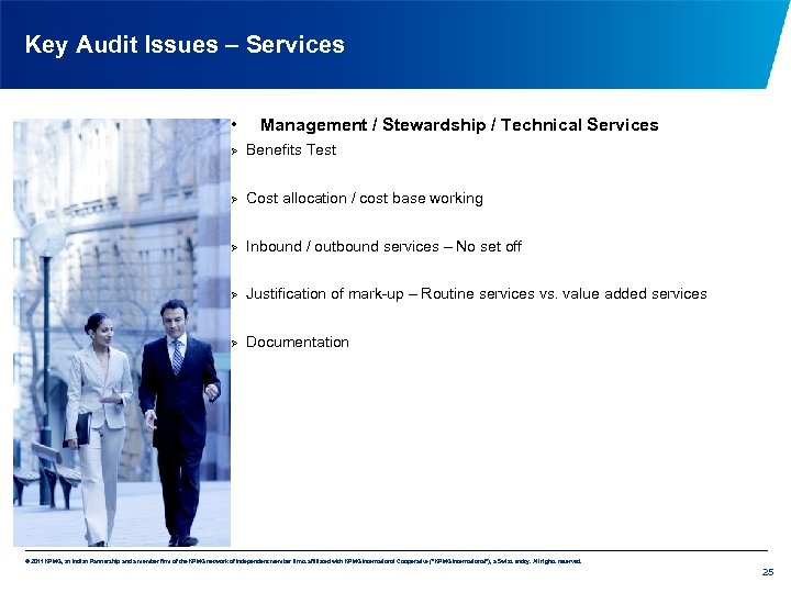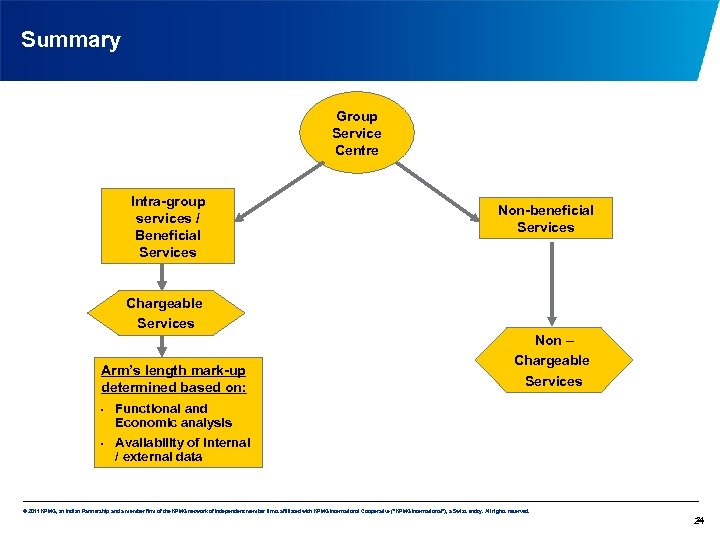 Summary Group Service Centre Intra-group services / Beneficial Services Non-beneficial Services Chargeable Services Arm’s length mark-up determined based on: • • Non – Chargeable Services Functional and Economic analysis Availability of internal / external data © 2011 KPMG, an Indian Partnership and a member firm of the KPMG network of independent member firms affiliated with KPMG International Cooperative (“KPMG International”), a Swiss entity. All rights reserved. 24 24