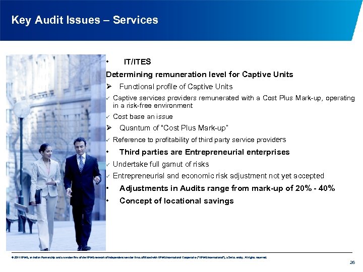 Key Audit Issues – Services • Management / Stewardship / Technical Services Ø Benefits Test Ø Cost allocation / cost base working Ø Inbound / outbound services – No set off Ø Justification of mark-up – Routine services vs. value added services Ø Documentation © 2011 KPMG, an Indian Partnership and a member firm of the KPMG network of independent member firms affiliated with KPMG International Cooperative (“KPMG International”), a Swiss entity. All rights reserved. 25