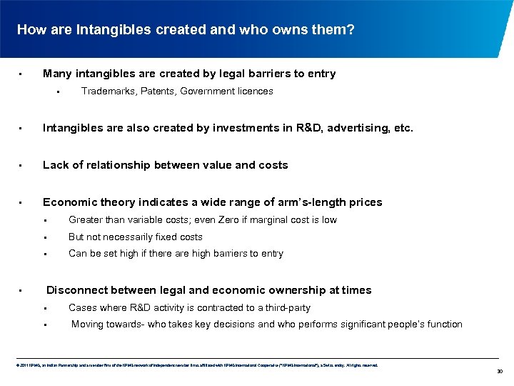 Intangibles Categories • Technology Intangibles Ø Ø Ø • Unpatented processes Know-how Marketing Intangibles generally associated with Ø Ø Ø • Patented processes/ Formulae/ Designs/ Models Brand name Trade name / Trademarks Copyrights Others (Customer lists/ Customer relationships, Supplier relationships, Contractual relationships) • Goodwill • Workforce in place © 2011 KPMG, an Indian Partnership and a member firm of the KPMG network of independent member firms affiliated with KPMG International Cooperative (“KPMG International”), a Swiss entity. All rights reserved. 29