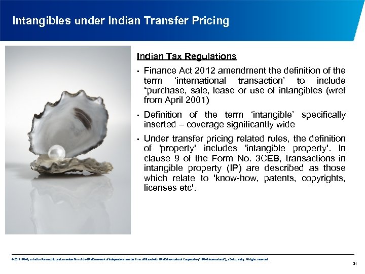 How are Intangibles created and who owns them? • Many intangibles are created by legal barriers to entry • Trademarks, Patents, Government licences • Intangibles are also created by investments in R&D, advertising, etc. • Lack of relationship between value and costs • Economic theory indicates a wide range of arm’s-length prices • • But not necessarily fixed costs • • Greater than variable costs; even Zero if marginal cost is low Can be set high if there are high barriers to entry Disconnect between legal and economic ownership at times • • Cases where R&D activity is contracted to a third-party Moving towards- who takes key decisions and who performs significant people’s function © 2011 KPMG, an Indian Partnership and a member firm of the KPMG network of independent member firms affiliated with KPMG International Cooperative (“KPMG International”), a Swiss entity. All rights reserved. 30
