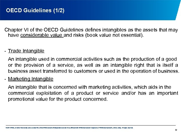 Intangibles under Indian Transfer Pricing Indian Tax Regulations • • • Finance Act 2012 amendment the definition of the term ‘international transaction’ to include “purchase, sale, lease or use of intangibles (wref from April 2001) Definition of the term ‘intangible’ specifically inserted – coverage significantly wide Under transfer pricing related rules, the definition of 'property' includes 'intangible property'. In clause 9 of the Form No. 3 CEB, transactions in intangible property (IP) are described as those which relate to 'know-how, patents, copyrights, licenses etc'. © 2011 KPMG, an Indian Partnership and a member firm of the KPMG network of independent member firms affiliated with KPMG International Cooperative (“KPMG International”), a Swiss entity. All rights reserved. 31