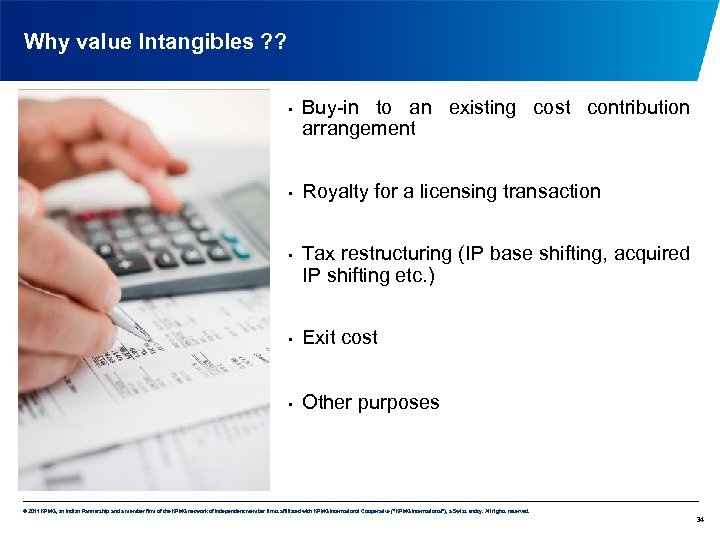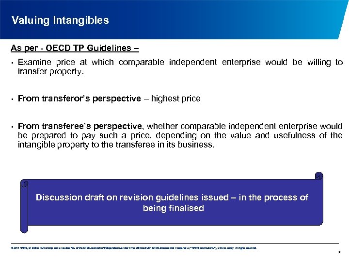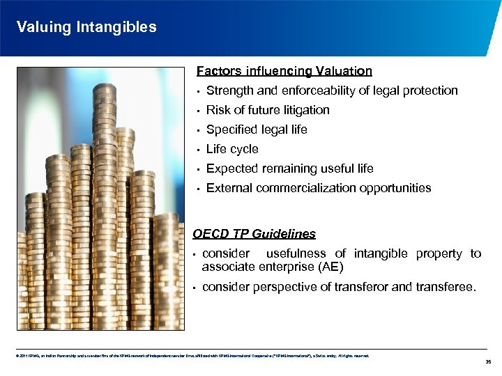 Why value Intangibles ? ? • • • Buy-in to an existing cost contribution arrangement Royalty for a licensing transaction Tax restructuring (IP base shifting, acquired IP shifting etc. ) • Exit cost • Other purposes © 2011 KPMG, an Indian Partnership and a member firm of the KPMG network of independent member firms affiliated with KPMG International Cooperative (“KPMG International”), a Swiss entity. All rights reserved. 34