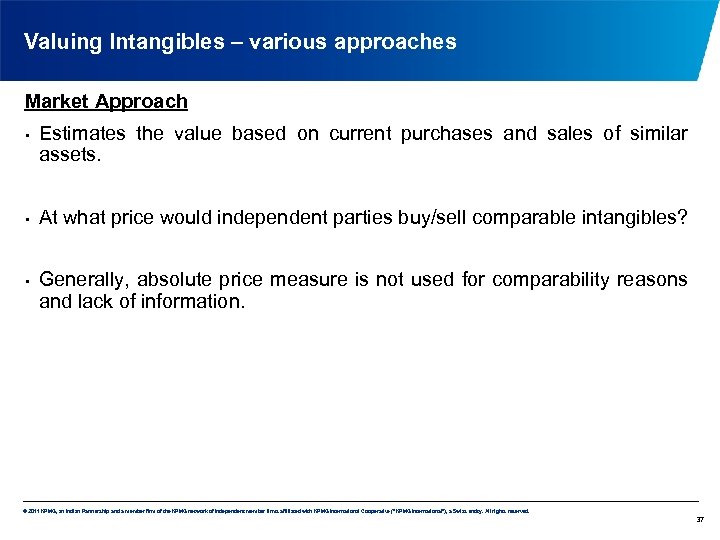 Valuing Intangibles As per - OECD TP Guidelines – • • • Examine price at which comparable independent enterprise would be willing to transfer property. From transferor’s perspective – highest price From transferee’s perspective, whether comparable independent enterprise would be prepared to pay such a price, depending on the value and usefulness of the intangible property to the transferee in its business. Discussion draft on revision guidelines issued – in the process of being finalised © 2011 KPMG, an Indian Partnership and a member firm of the KPMG network of independent member firms affiliated with KPMG International Cooperative (“KPMG International”), a Swiss entity. All rights reserved. 36