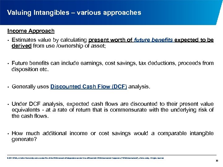 Valuing Intangibles – various approaches Income Approach • • • Estimates value by calculating present worth of future benefits expected to be derived from use /ownership of asset; Future benefits can include earnings, cost savings, tax deductions, proceeds from disposition etc. Generally uses Discounted Cash Flow (DCF) analysis. Under DCF analysis, expected cash flows are discounted to their present value equivalents - at a rate of return that is commensurate with the underlying risk of the cash flows. How much additional income or cost savings would a comparable intangible generate? © 2011 KPMG, an Indian Partnership and a member firm of the KPMG network of independent member firms affiliated with KPMG International Cooperative (“KPMG International”), a Swiss entity. All rights reserved. 38