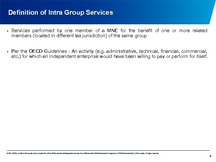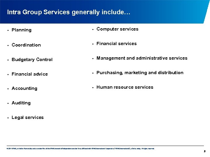 Definition of Intra Group Services • • Services performed by one member of a MNE for the benefit of one or more related members (located in different tax jurisdiction) of the same group Per the OECD Guidelines - An activity (e. g. administrative, technical, financial, commercial, etc. ) for which an independent enterprise would have been willing to pay or perform for itself. © 2011 KPMG, an Indian Partnership and a member firm of the KPMG network of independent member firms affiliated with KPMG International Cooperative (“KPMG International”), a Swiss entity. All rights reserved. 4 4