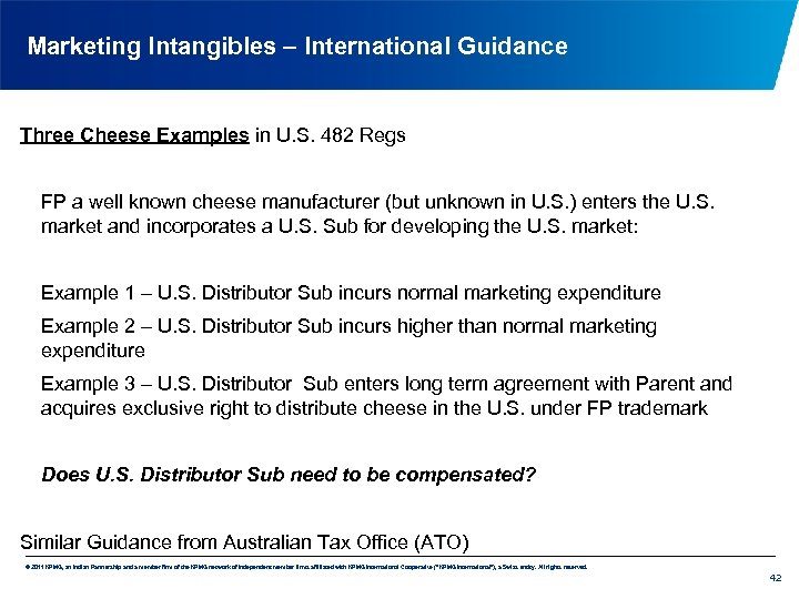 Marketing Intangibles – General Concept (2/2) Economic concept – no legal ownership or legal protection Derived from valuable marketing activities performed for developing / maintaining a brand or brand Created by the entity that invests to give the brand or trademark its value High marketing expenditure by a subsidiary is increasingly being scrutinized by revenue authorities – The authorities are either a) Disallowing AMP expenditure of distributor b) Deeming a service fee for the marketing effort c) Expect higher marketing margins as return for investment © 2011 KPMG, an Indian Partnership and a member firm of the KPMG network of independent member firms affiliated with KPMG International Cooperative (“KPMG International”), a Swiss entity. All rights reserved. 41