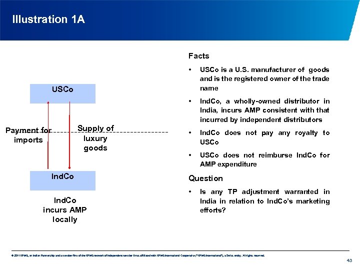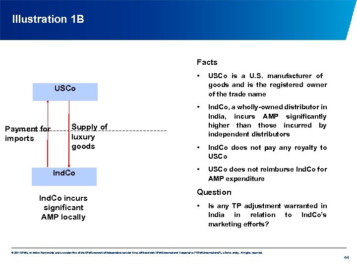 Illustration 1 A Facts • USCo is a U. S. manufacturer of goods and is the registered owner of the trade name • Ind. Co, a wholly-owned distributor in India, incurs AMP consistent with that incurred by independent distributors • Ind. Co does not pay any royalty to USCo • USCo does not reimburse Ind. Co for AMP expenditure USCo Payment for imports Supply of luxury goods Ind. Co incurs AMP locally Question • Is any TP adjustment warranted in India in relation to Ind. Co’s marketing efforts? © 2011 KPMG, an Indian Partnership and a member firm of the KPMG network of independent member firms affiliated with KPMG International Cooperative (“KPMG International”), a Swiss entity. All rights reserved. 43