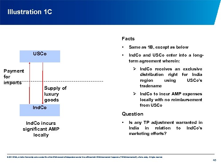 Illustration 1 B Facts • USCo is a U. S. manufacturer of goods and is the registered owner of the trade name • Ind. Co, a wholly-owned distributor in India, incurs AMP significantly higher than those incurred by independent distributors • Ind. Co does not pay any royalty to USCo • USCo does not reimburse Ind. Co for AMP expenditure USCo Payment for imports Supply of luxury goods Ind. Co incurs significant AMP locally Question • Is any TP adjustment warranted in India in relation to Ind. Co’s marketing efforts? © 2011 KPMG, an Indian Partnership and a member firm of the KPMG network of independent member firms affiliated with KPMG International Cooperative (“KPMG International”), a Swiss entity. All rights reserved. 44