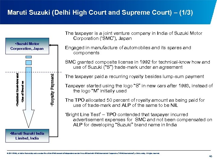 Maruti Suzuki (Delhi High Court and Supreme Court) – (1/3) The taxpayer is a joint venture company in India of Suzuki Motor Corporation (‘SMC’), Japan • Suzuki Motor Corporation, Japan Engaged in manufacture of automobiles and its spares and components SMC granted composite license in 1992 for technical-know how and use of Suzuki (“S”) trade-mark under an agreement The taxpayer paid a recurring royalty besides lump-sum payment Taxpayer started using the logo “S” in new cars after 1993, instead of the logo “M” initially used The TPO allocated 50 percent of royalty amount as being paid for use of trade-mark and ALP of the same to be NIL ‘Bright Line Test’ – TPO contended that taxpayer incurred advertisement expenses for SMC and not been compensated on ALP for developing “Suzuki” brand name in India • Maruti Suzuki India Limited, India © 2011 KPMG, an Indian Partnership and a member firm of the KPMG network of independent member firms affiliated with KPMG International Cooperative (“KPMG International”), a Swiss entity. All rights reserved. 46