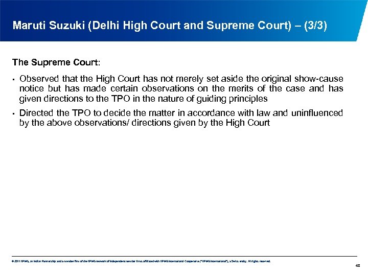 Maruti Suzuki (Delhi High Court and Supreme Court) – (2/3) Delhi High Court’s (HC) ruling – Marketing Intangibles Principles: • • • Transaction relating to marketing intangibles to be viewed in context of market conditions If use of foreign trade mark is mandatory, compensation for marketing intangibles to be paid by foreign AE to domestic entity A domestic company is entitled to receive compensation for value creation and incremental mileage foreign brand Bright-line test for AMP expenditure to be viewed in conjunction with benefits-nburden test To determine the adequacy of AMP expenditure, it is necessary to identify appropriate comparables The HC set aside the order and directed the TPO to determine the appropriate ALP based on the above © 2011 KPMG, an Indian Partnership and a member firm of the KPMG network of independent member firms affiliated with KPMG International Cooperative (“KPMG International”), a Swiss entity. All rights reserved. 47