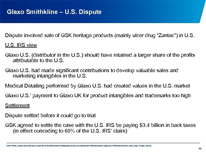 Glaxo Smithkline – U. S. Dispute involved sale of GSK heritage products (mainly ulcer drug “Zantac”) in U. S. IRS view Glaxo U. S. (distributor in the U. S. ) should have retained a larger share of the profits attributable to the U. S. Glaxo U. S. had made significant contributions to develop valuable sales and marketing intangibles in the U. S. Medical Detailing performed by Glaxo U. S. had created values in the U. S. market Glaxo U. S. ’ payment to Glaxo UK for product intangibles and trademarks too high Settlement Dispute settled before it could go to trial GSK agreed to settle the case with the U. S. IRS be paying $3. 4 billion in back taxes (in effect conceding to 60% of the U. S. IRS’ claim) © 2011 KPMG, an Indian Partnership and a member firm of the KPMG network of independent member firms affiliated with KPMG International Cooperative (“KPMG International”), a Swiss entity. All rights reserved. 49