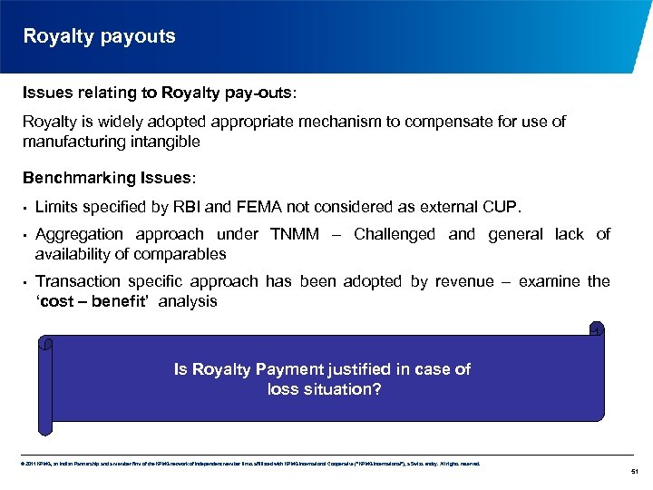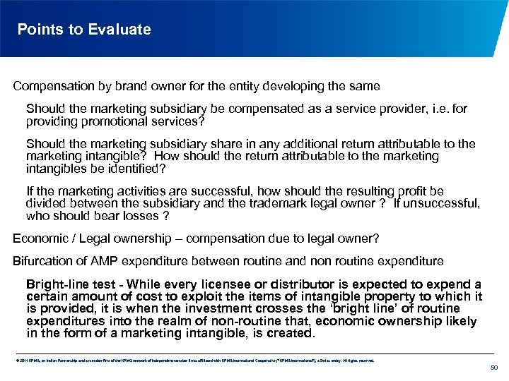 Points to Evaluate Compensation by brand owner for the entity developing the same Should the marketing subsidiary be compensated as a service provider, i. e. for providing promotional services? Should the marketing subsidiary share in any additional return attributable to the marketing intangible? How should the return attributable to the marketing intangibles be identified? If the marketing activities are successful, how should the resulting profit be divided between the subsidiary and the trademark legal owner ? If unsuccessful, who should bear losses ? Economic / Legal ownership – compensation due to legal owner? Bifurcation of AMP expenditure between routine and non routine expenditure Bright-line test - While every licensee or distributor is expected to expend a certain amount of cost to exploit the items of intangible property to which it is provided, it is when the investment crosses the ‘bright line’ of routine expenditures into the realm of non-routine that, economic ownership likely in the form of a marketing intangible, is created. © 2011 KPMG, an Indian Partnership and a member firm of the KPMG network of independent member firms affiliated with KPMG International Cooperative (“KPMG International”), a Swiss entity. All rights reserved. 50