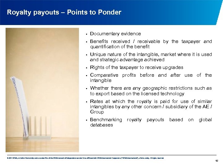 Royalty payouts Issues relating to Royalty pay-outs: Royalty is widely adopted appropriate mechanism to compensate for use of manufacturing intangible Benchmarking Issues: • • • Limits specified by RBI and FEMA not considered as external CUP. Aggregation approach under TNMM – Challenged and general lack of availability of comparables Transaction specific approach has been adopted by revenue – examine the ‘cost – benefit’ analysis Is Royalty Payment justified in case of loss situation? © 2011 KPMG, an Indian Partnership and a member firm of the KPMG network of independent member firms affiliated with KPMG International Cooperative (“KPMG International”), a Swiss entity. All rights reserved. 51