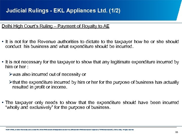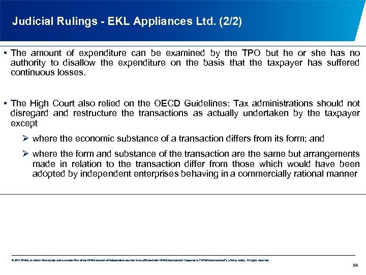 Judicial Rulings - EKL Appliances Ltd. (1/2) Delhi High Court’s Ruling – Payment of Royalty to AE • It is not for the Revenue authorities to dictate to the taxpayer how he or she should conduct his business and what expenditure should be incurred. • It is not necessary for the taxpayer to show that any legitimate expenditure incurred by him or her : Øwas also incurred out of necessity or Øthat the expenditure incurred by him or her for the purpose of business has actually resulted in profit or income. • The taxpayer only needs to show that the expenditure should have been incurred “wholly and exclusively” for the purpose of business. © 2011 KPMG, an Indian Partnership and a member firm of the KPMG network of independent member firms affiliated with KPMG International Cooperative (“KPMG International”), a Swiss entity. All rights reserved. 53