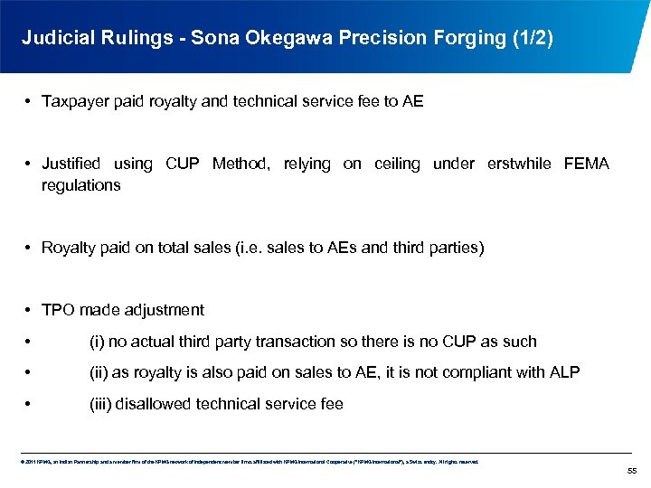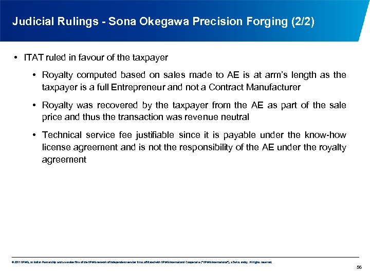 Judicial Rulings - Sona Okegawa Precision Forging (1/2) • Taxpayer paid royalty and technical service fee to AE • Justified using CUP Method, relying on ceiling under erstwhile FEMA regulations • Royalty paid on total sales (i. e. sales to AEs and third parties) • TPO made adjustment • (i) no actual third party transaction so there is no CUP as such • (ii) as royalty is also paid on sales to AE, it is not compliant with ALP • (iii) disallowed technical service fee © 2011 KPMG, an Indian Partnership and a member firm of the KPMG network of independent member firms affiliated with KPMG International Cooperative (“KPMG International”), a Swiss entity. All rights reserved. 55