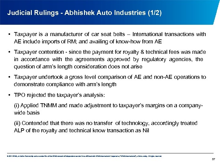Judicial Rulings - Sona Okegawa Precision Forging (2/2) • ITAT ruled in favour of the taxpayer • Royalty computed based on sales made to AE is at arm’s length as the taxpayer is a full Entrepreneur and not a Contract Manufacturer • Royalty was recovered by the taxpayer from the AE as part of the sale price and thus the transaction was revenue neutral • Technical service fee justifiable since it is payable under the know-how license agreement and is not the responsibility of the AE under the royalty agreement © 2011 KPMG, an Indian Partnership and a member firm of the KPMG network of independent member firms affiliated with KPMG International Cooperative (“KPMG International”), a Swiss entity. All rights reserved. 56