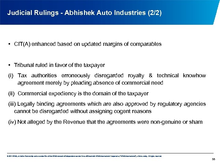 Judicial Rulings - Abhishek Auto Industries (1/2) • Taxpayer is a manufacturer of car seat belts – International transactions with AE include imports of RM; and availing of know-how from AE • Taxpayer contention - since the payment for royalty & technical fees was made in accordance with the agreements approved by regulatory agencies, the question of arm’s length consideration does not arise • Taxpayer undertook a gross level comparison of AE and non-AE operations to demonstrate compliance with arm’s length • TPO rejected the taxpayer’s analysis: (i) Applied TNMM and made adjustment to taxpayer’s margins on a companywide basis (ii) Contended that there was no transfer of technology, accordingly treated ALP of the royalty and technical know transaction as Nil © 2011 KPMG, an Indian Partnership and a member firm of the KPMG network of independent member firms affiliated with KPMG International Cooperative (“KPMG International”), a Swiss entity. All rights reserved. 57