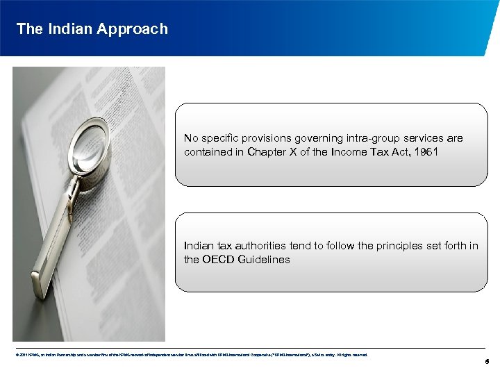 Intra Group Services generally include… • Planning • Computer services • Coordination • Financial services • Budgetary Control • Management and administrative services • Financial advice • Purchasing, marketing and distribution • Accounting • Human resource services • Auditing • Legal services © 2011 KPMG, an Indian Partnership and a member firm of the KPMG network of independent member firms affiliated with KPMG International Cooperative (“KPMG International”), a Swiss entity. All rights reserved. 5 5