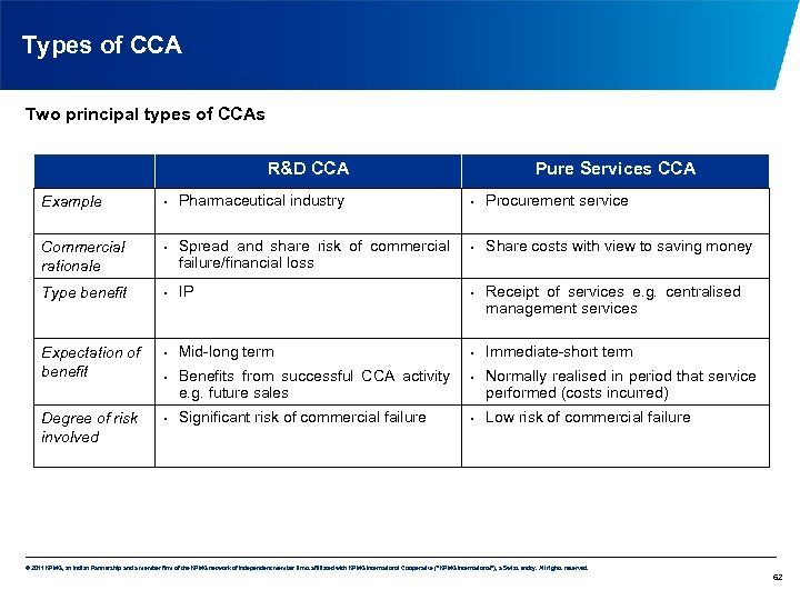 Cost Contribution Arrangement – An Introduction Wherein : • • D • • C • E • XYZ Ltd • • • B • A • XYZ Ltd. is a R&D centre A, B, C, D & E are participant entities at various geographical locations A, B, C, D&E bring in consideration in return for the Technical know how they get from XYZ Ltd. A, B, C, D & E share the cost & risk of XYZ Ltd. On entering a contractual framework it becomes a CCA. © 2011 KPMG, an Indian Partnership and a member firm of the KPMG network of independent member firms affiliated with KPMG International Cooperative (“KPMG International”), a Swiss entity. All rights reserved. 61