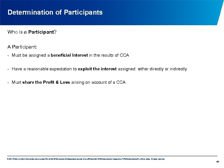 Transfer Pricing Implications • Determination of Participants • Buy-in / Buy-out Adjustments • Balancing Payments • Determination of cost base • Appropriateness of allocation & contribution • Consequences of a non-ALP CCA © 2011 KPMG, an Indian Partnership and a member firm of the KPMG network of independent member firms affiliated with KPMG International Cooperative (“KPMG International”), a Swiss entity. All rights reserved. 63