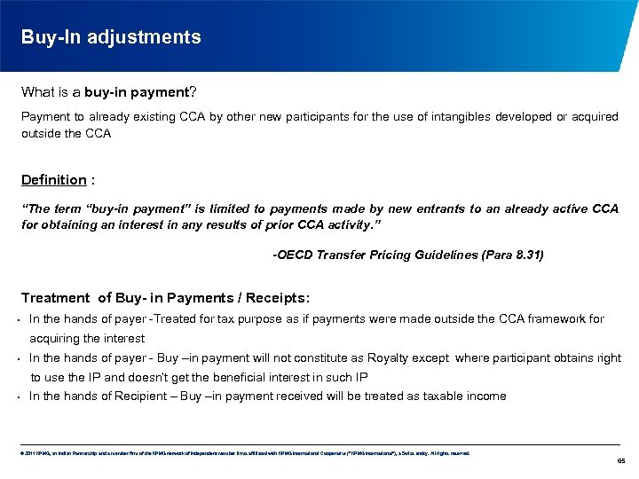 Determination of Participants Who is a Participant? A Participant: • Must be assigned a beneficial Interest in the results of CCA • Have a reasonable expectation to exploit the interest assigned either directly or indirectly • Must share the Profit & Loss arising on account of a CCA © 2011 KPMG, an Indian Partnership and a member firm of the KPMG network of independent member firms affiliated with KPMG International Cooperative (“KPMG International”), a Swiss entity. All rights reserved. 64
