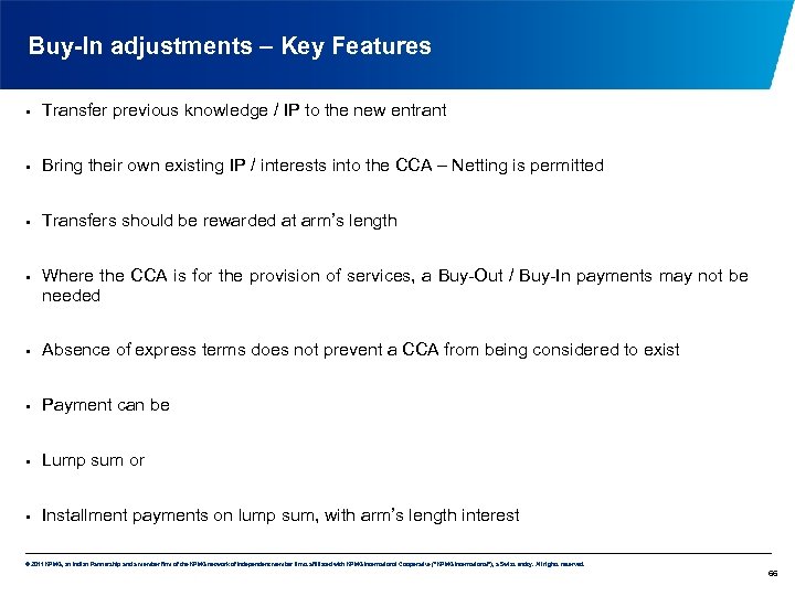 Buy-In adjustments What is a buy-in payment? Payment to already existing CCA by other new participants for the use of intangibles developed or acquired outside the CCA Definition : “The term “buy-in payment” is limited to payments made by new entrants to an already active CCA for obtaining an interest in any results of prior CCA activity. ” -OECD Transfer Pricing Guidelines (Para 8. 31) Treatment of Buy- in Payments / Receipts: • In the hands of payer -Treated for tax purpose as if payments were made outside the CCA framework for acquiring the interest • In the hands of payer - Buy –in payment will not constitute as Royalty except where participant obtains right to use the IP and doesn’t get the beneficial interest in such IP • In the hands of Recipient – Buy –in payment received will be treated as taxable income © 2011 KPMG, an Indian Partnership and a member firm of the KPMG network of independent member firms affiliated with KPMG International Cooperative (“KPMG International”), a Swiss entity. All rights reserved. 65