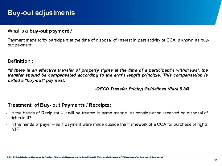 Buy-In adjustments – Key Features • Transfer previous knowledge / IP to the new entrant • Bring their own existing IP / interests into the CCA – Netting is permitted • Transfers should be rewarded at arm’s length • Where the CCA is for the provision of services, a Buy-Out / Buy-In payments may not be needed • Absence of express terms does not prevent a CCA from being considered to exist • Payment can be • Lump sum or • Installment payments on lump sum, with arm’s length interest © 2011 KPMG, an Indian Partnership and a member firm of the KPMG network of independent member firms affiliated with KPMG International Cooperative (“KPMG International”), a Swiss entity. All rights reserved. 66
