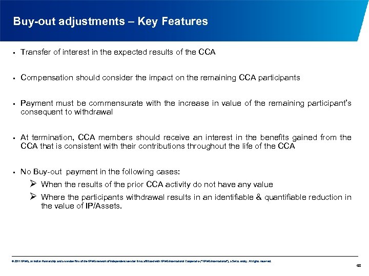 Buy-out adjustments What is a buy-out payment? Payment made to/by participant at the time of disposal of interest in past activity of CCA is known as buyout payment. Definition : “If there is an effective transfer of property rights at the time of a participant’s withdrawal, the transfer should be compensated according to the arm’s length principle. This compensation is called a “buy-out” payment. ” -OECD Transfer Pricing Guidelines (Para 8. 34) Treatment of Buy- out Payments / Receipts: • • In the hands of Recipient – it will be treated in same manner as consideration received on disposal of rights in IP In the hands of payer – as if payment were made outside the framework of a CCA for purchase of rights in IP © 2011 KPMG, an Indian Partnership and a member firm of the KPMG network of independent member firms affiliated with KPMG International Cooperative (“KPMG International”), a Swiss entity. All rights reserved. 67